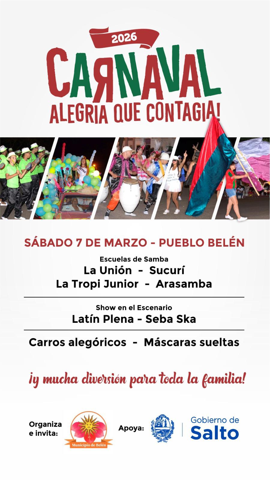 El Gobierno de Salto invita a la población a participar de las celebraciones de Carnaval que tendrán lugar este sábado 7 de marzo en dicha localidad.